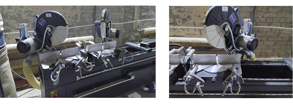 Безопасность оператора обеспечивается двухкнопочным запуском процесса пиления и мощными защитными интегрированными кожухами пильных дисков, автоматически закрывающими доступ к ним во время обработки профиля.